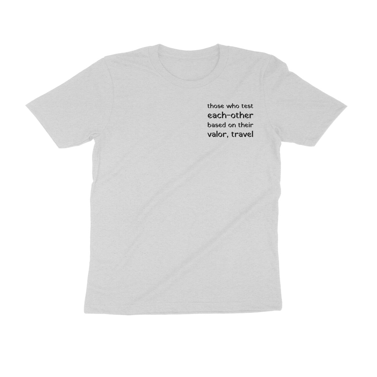 honor the spirit of camaraderie and adventure with our "अन्योन्यवीर्यनिकषाः पुरुषा भ्रमन्ति" t-shirt, meaning "those who test each other based on their valor, travel." perfect for those who seek challenge and growth through shared journeys, this tee celebrates the strength and bond forged by exploring the world together.