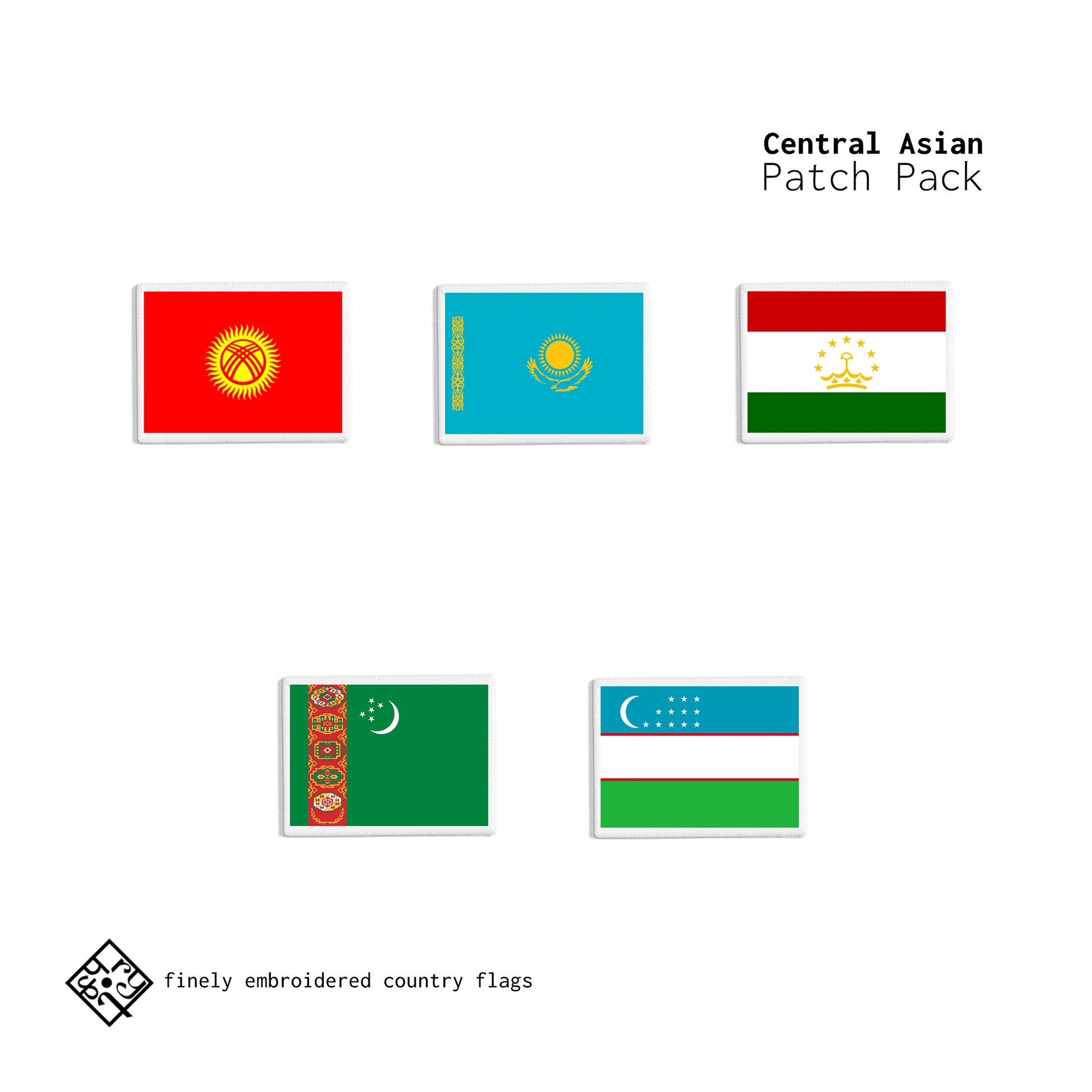explore the heart of central asia with this patch pack featuring the flags of kazakhstan, uzbekistan, kyrgyzstan, tajikistan, and turkmenistan. each finely embroidered patch is perfect for personalizing your travel gear, backpacks, or jackets. a stylish way to celebrate and honor central asian cultures!