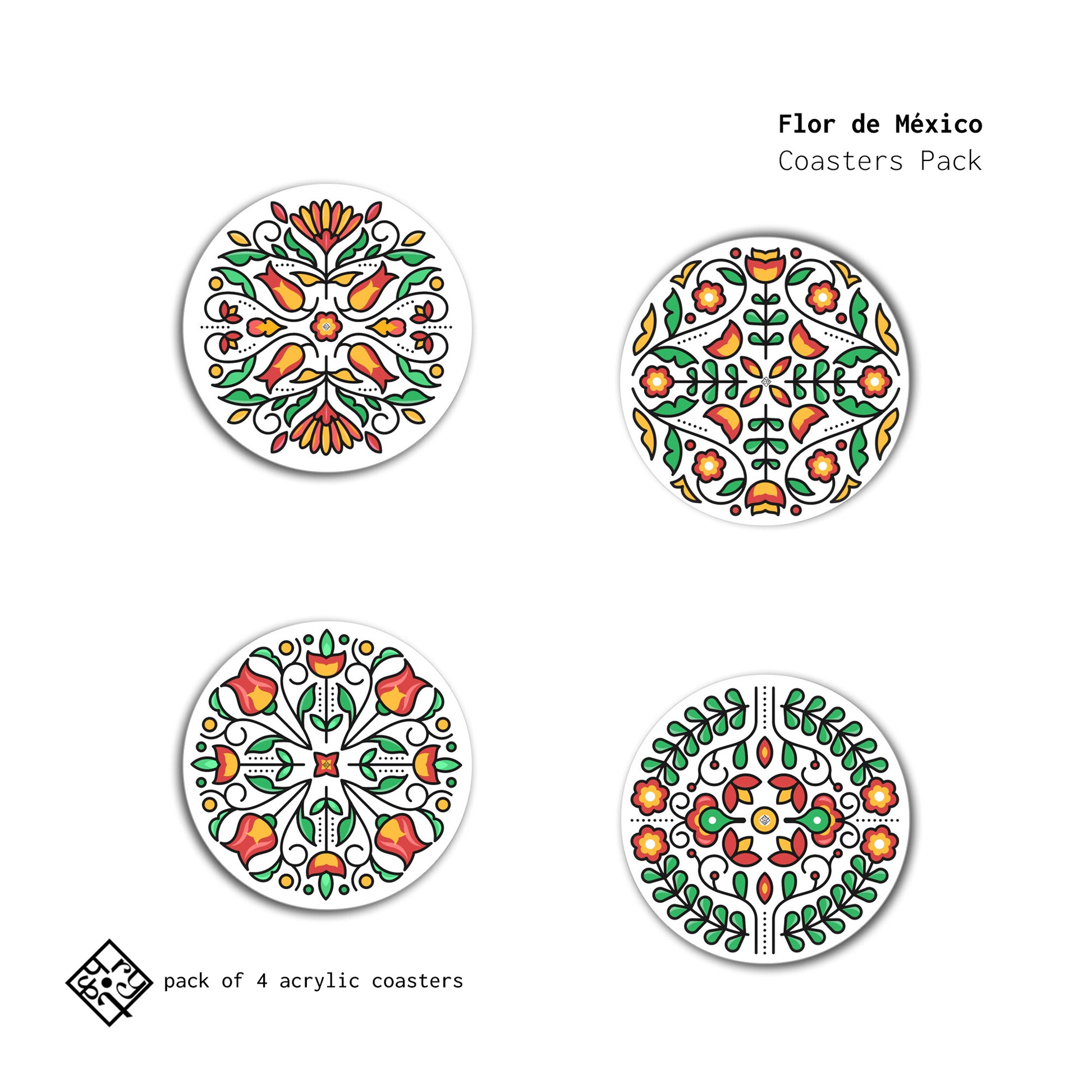 embrace the beauty of tradition with a set of four coasters inspired by mexican floral artistry. each piece bursts with bold colors and intricate details, capturing the joy of festivity and the warmth of culture. perfect for adding vibrance and charm to your gatherings.