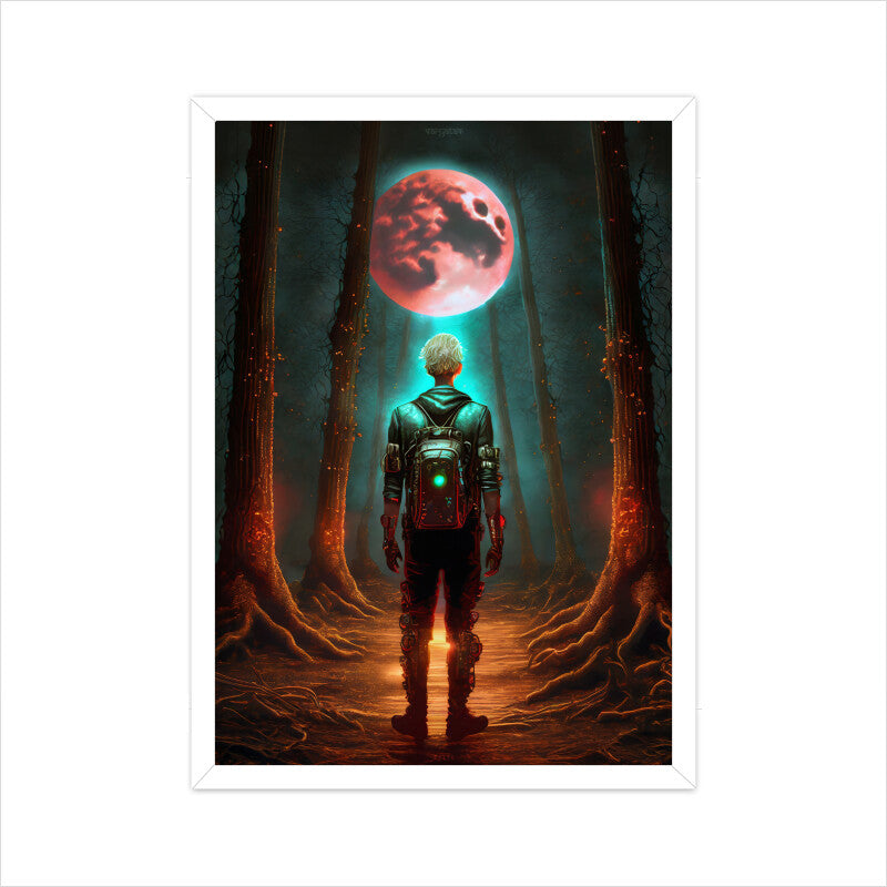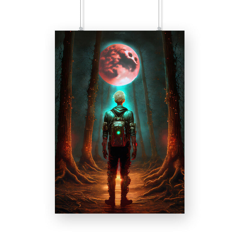 embark on a journey beyond time and space with our mesmerizing poster. amidst the shadowy depths of the forest, a lone figure, draped in futuristic attire, stands as a beacon of mystery and adventure. perfect for sci-fi enthusiasts and dreamers of the unknown, available in both A3 and A4 sizes. let this captivating image ignite your imagination and transport you to realms where the boundaries of time blur and the possibilities are endless.