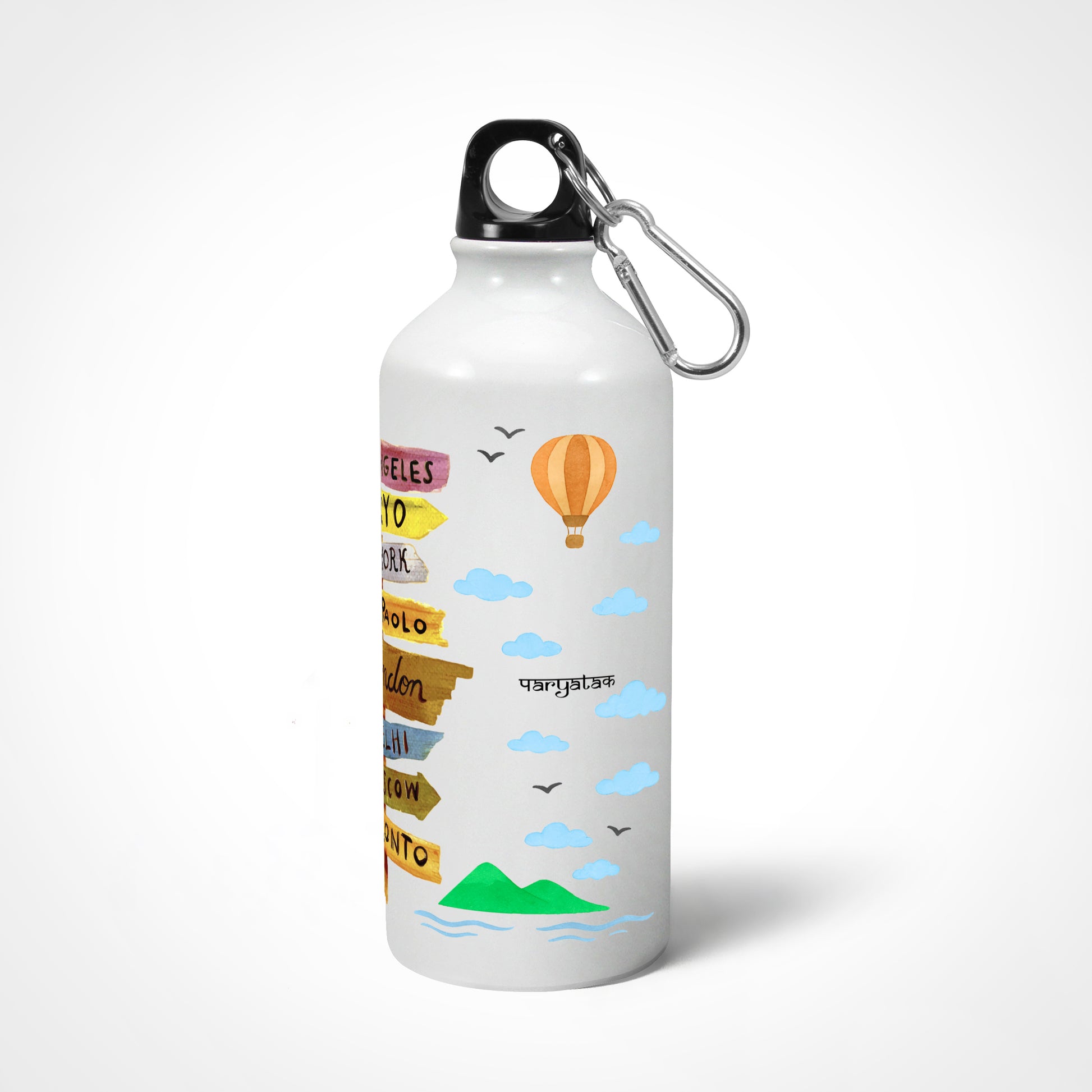 navigate your dreams with our global signboard sipper. featuring a colorful signboard of world countries with nature's scenic elements, this bottle brings the spirit of travel to life. perfect for those who love collecting memories and stories from faraway places. a true companion for dreamers who live to discover new destinations.