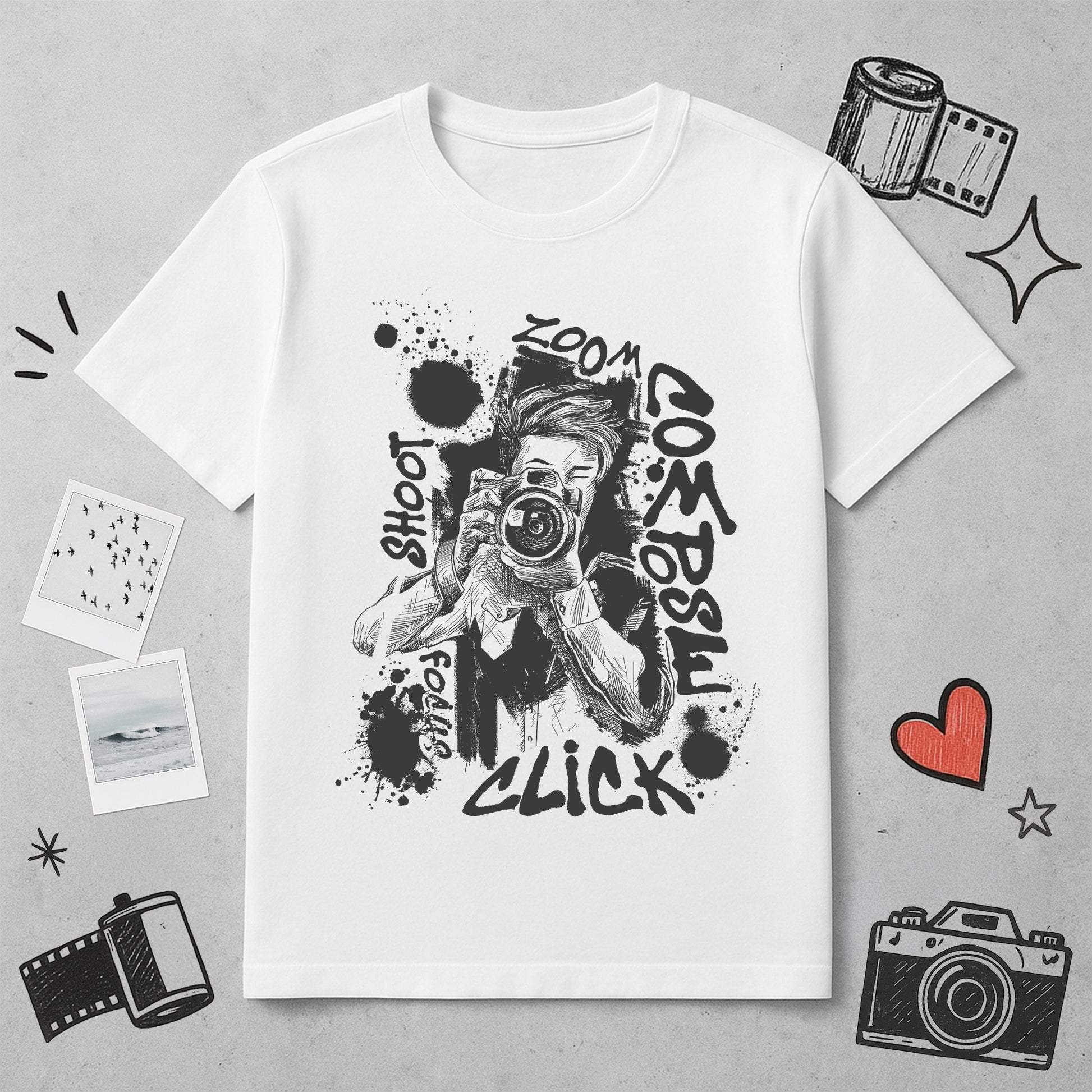 blend urban artistry with your love for photography with our t-shirt. featuring a dynamic sketch of a photographer with graffiti, this t-shirt is perfect for enthusiasts of the art of photography. celebrate creativity and spontaneity wherever your adventures take you.