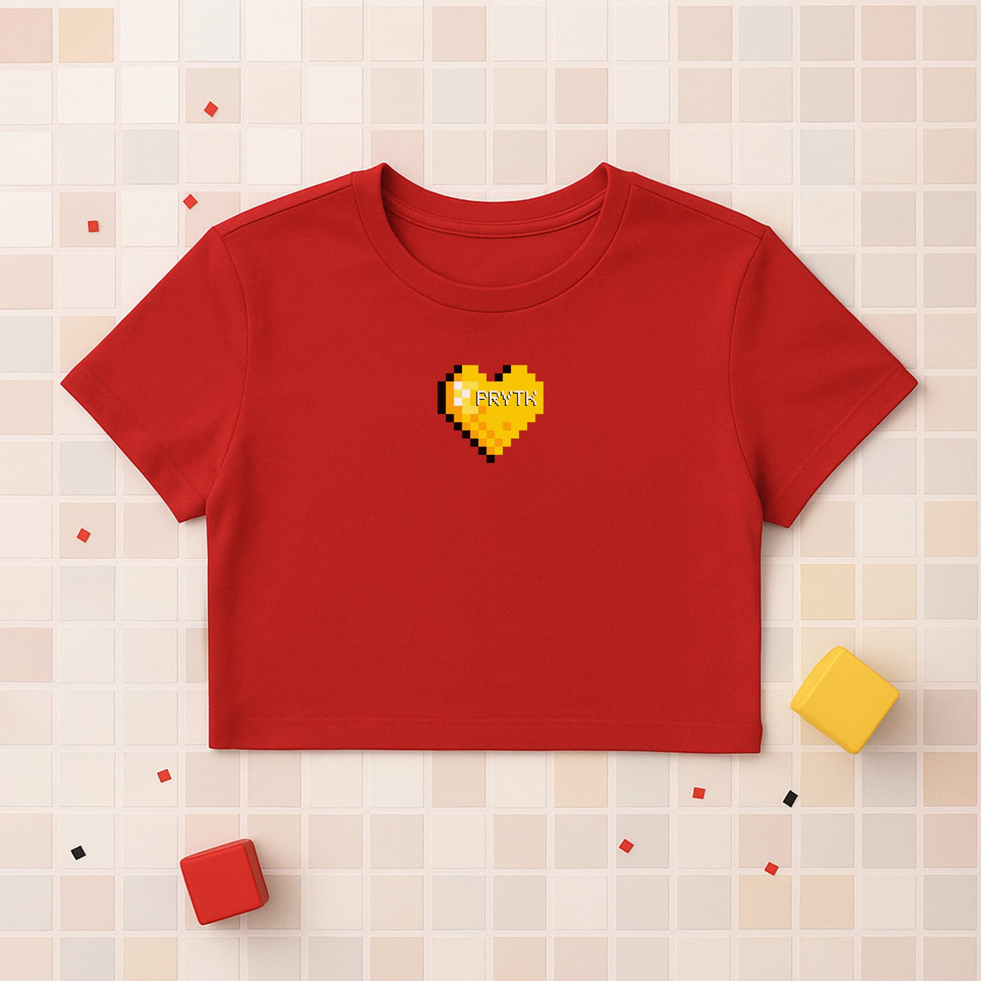 this PRYTK yellow pixel heart crop top has a minimalist charm symbolizing love for travel and identity. perfect for those who wear their passion close to heart, boldly yet subtly. it’s a versatile piece for travel and beyond.