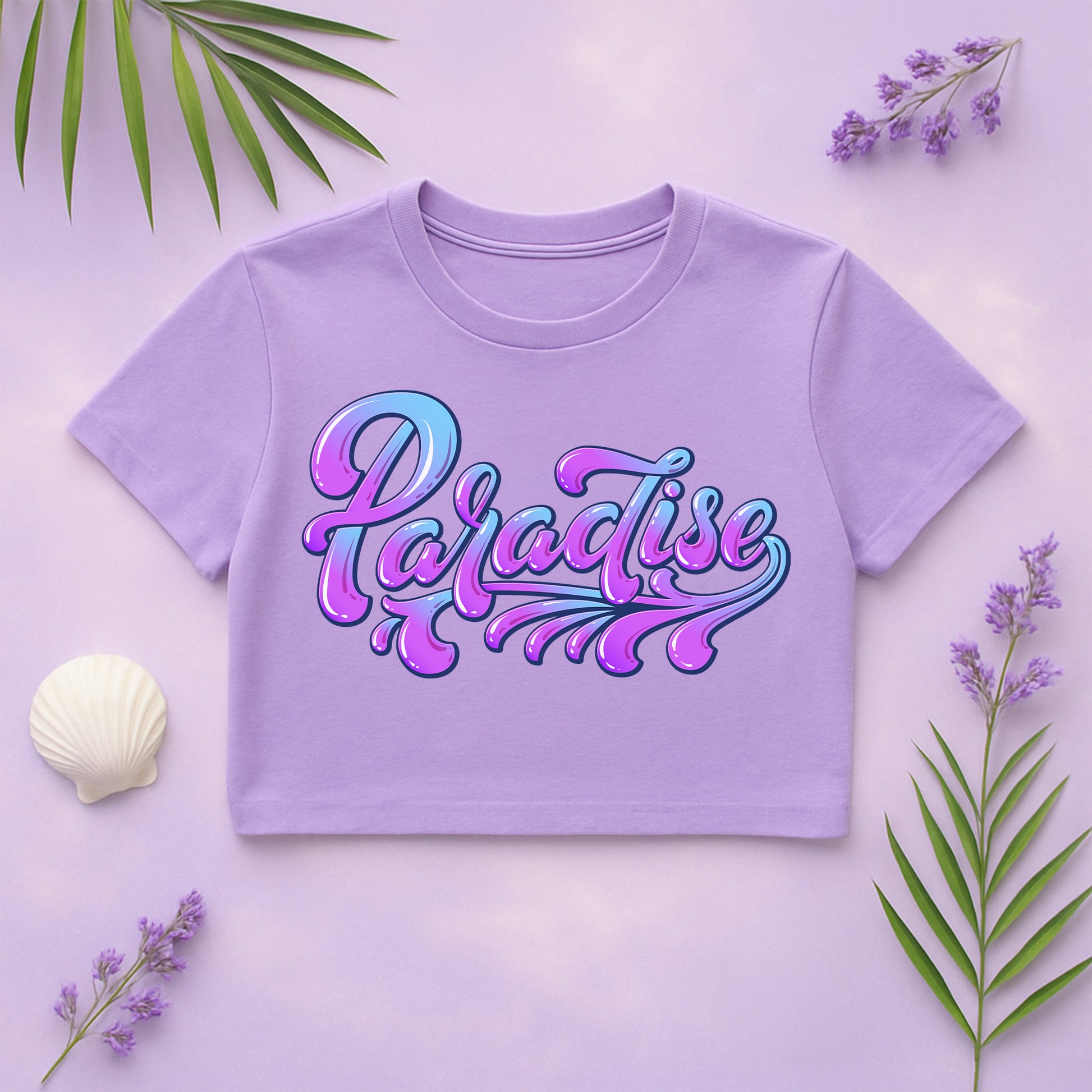 this crop top blends dreamy vibes with wanderlust, featuring the word paradise in purple hues. perfect for travelers who find beauty in bold colors and distant dreams.