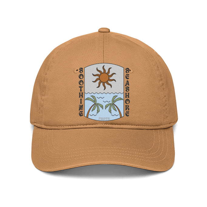 embrace the calm with this cap, featuring serene beach inspired embroidery. perfect for those who love the peaceful vibes of coastal escapes and seaside adventures.