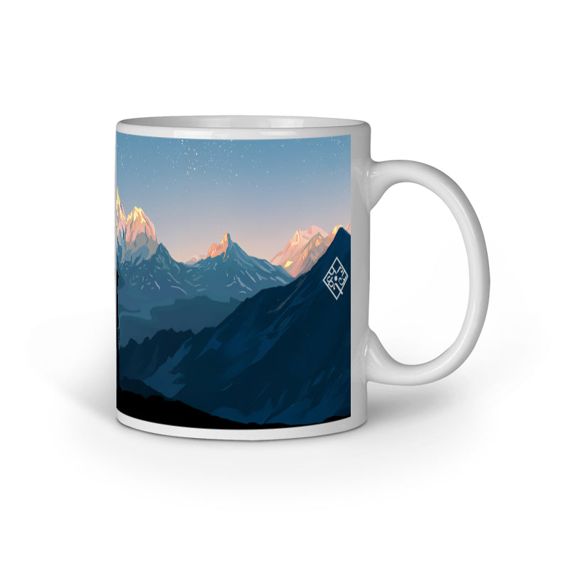 embrace the spirit of adventure with this design featuring a trekker against a stunning mountain backdrop at twilight. perfect for hikers and explorers, this mug captures the thrill of the journey and the beauty of nature.