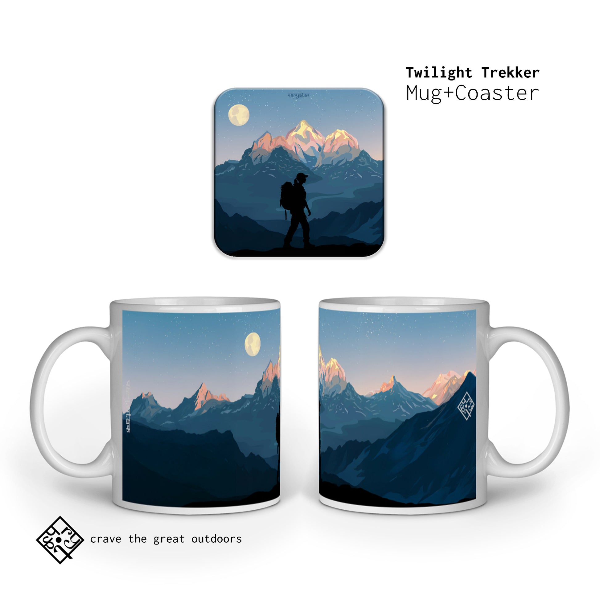 capture the spirit of adventure with this mug and coaster set, featuring a trekker against a stunning mountain backdrop - perfect for those who crave the great outdoors.