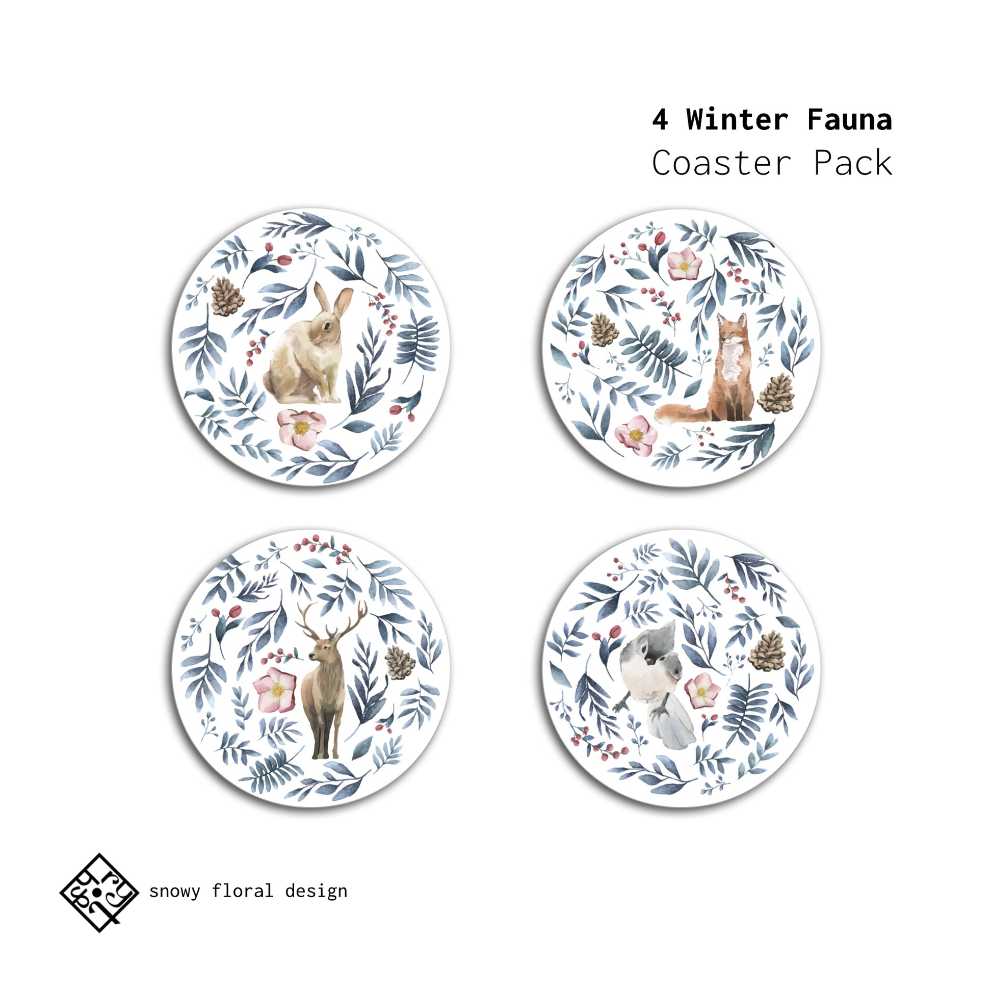 embrace the beauty of winter with a set of four coasters featuring intricate designs of various woodland creatures in serene snowy settings. they capture the essence of the season, adding a charming and nature-inspired touch to your home.